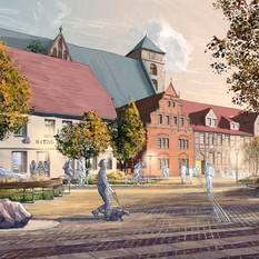Unser Entwurf setzt auf eine klimaresiliente und menschengerechte Gestaltung der beiden Plätze Geschichte trifft Zukunft: mehr Grün, weniger Verkehr, mehr Raum für Menschen, Märkte & Begegnung.