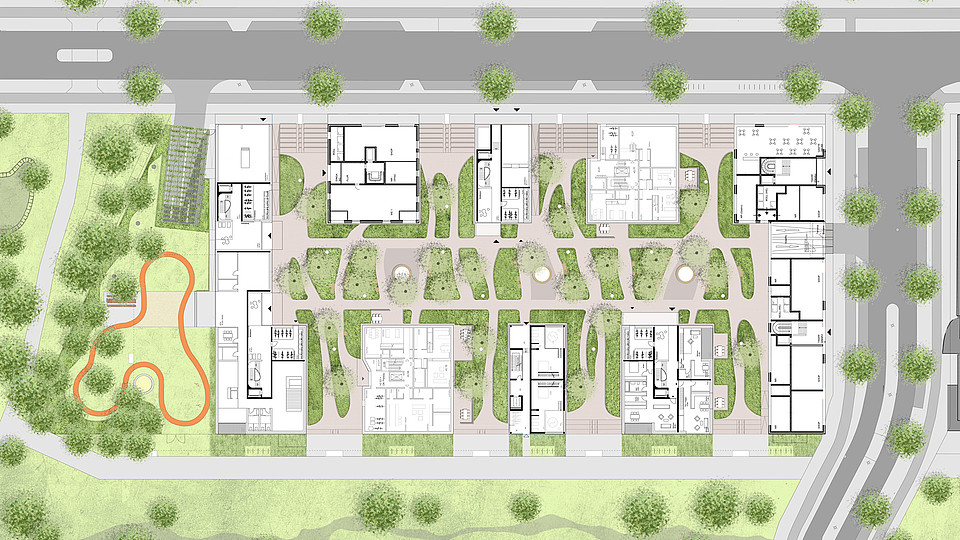 Rhododendronskulpturen in organisch geformten Beeten durchziehen den Innenhof. Ihre jeweilige Gestaltung lehnt sich an die Haustypologien und die unterschiedlichen Bedürfnisse nach Öffentlichkeit oder Privatheit an. Zudem sind darin technische Einbauten unauffällig integriert. In dieses Zusammenspiel von Öffnung und Weite sind unaufgeregt Spielflächen eingestreut, all dies mittelfristig betrachtet von lockerkronigen Solitärbäumen diffus beschattet.